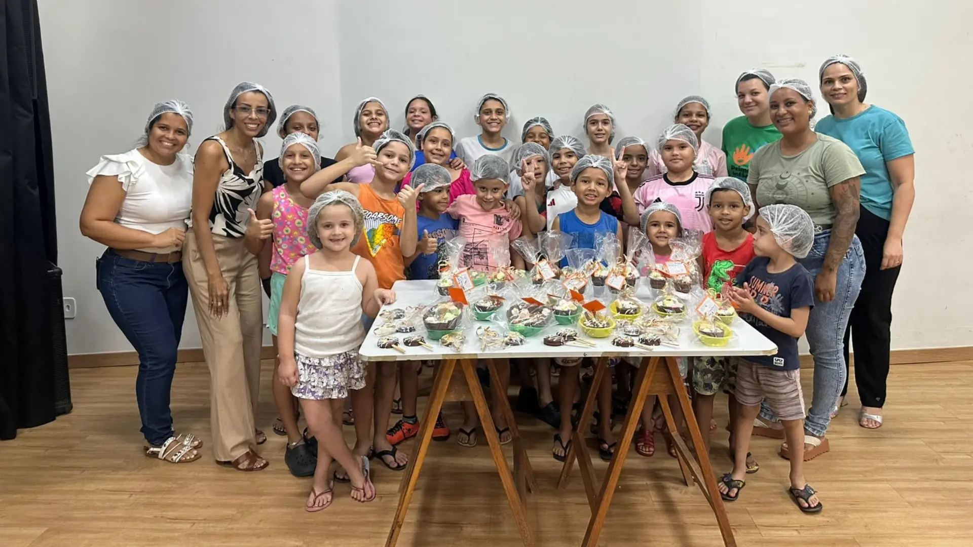 A atividade contou com o apoio de toda a equipe, garantindo que cada uma das crianças pudesse montar seu doce de forma divertida e segura.